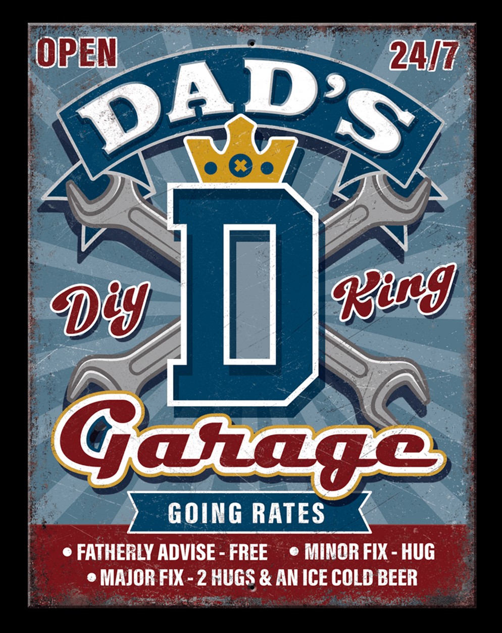 8 1/4" X 10 3/4" TIN SIGN DAD'S GARAGE OPEN 24/7 DIY KING METAL SIGN NEW